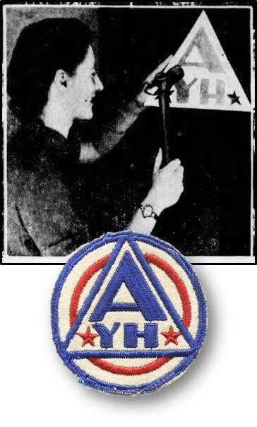 ![]() Miss Betty Blogett, Field Director for the California area, nails an AYH sign in place. AYH patch 1937 |