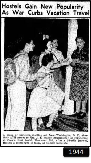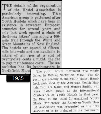 When Monroe and Isabel Smith returned from a trip to Europe and had discovered the unique adventure of youth hostelling, they knew it was an idea whose time had come for America. So, officially on March 16, 1934 the American Youth Hostels Association started with a bang in Northfield, Massachusetts. Within weeks the Charter #1 Hostel had grown to several hostels, with the idea that hostels would be available every 15 miles or so along designated routes in New England - and eventually all across America.