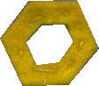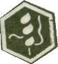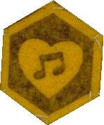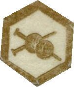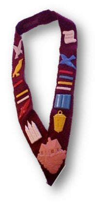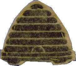 Felt emblems of rank: brown bee hive and gold hexagonal cell for a girl just joining, 2 blue violets were awarded after completing "Trial Flights", and the gold Queen Bee awarded at the beginning of the Guardian rank. These were worn on an azure blue felt sash. |