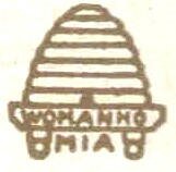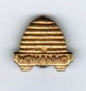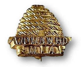 Bee-Hive Girl Enrollment pin. A girl had to earn the 25 cents to purchase the pin. The pin spelled WOMANHO and MIA. Later pins did not have MIA. |