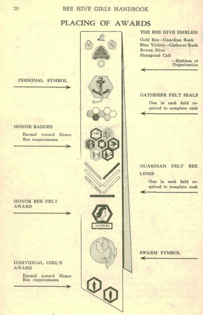 1n 1934 these changes were approved: Membership: 12,13 and 14 year old girls Ranks changed to: Builder in the Hive (age 12), Gatherer of Honey (13) and Guardian of the Treasure (14). Honor Bee Hive Girl was the highest honor a girl could earn. 1940 was the Silver Jubilee of the Bee-Hive Program, celebrating 25 years. Since the program officially began in 1913, it is curious that it was celebrated in the 27th year. In 1950 the program changed to a 2-years program with 2 ranks; Gatherer (age 12) and Guardian (age 13). Girls who wished to could work on additional honors as Worker Bee and Honor Bee. After 1951 the rank titles were dropped, and girls were simply first or second year Bee Hive Girls. Uniform: Azure Blue Sash over a white blouse, dark blue skirt. This was modified later to allow white skirts, as long as all the girls of the group wore the same color skirt. |