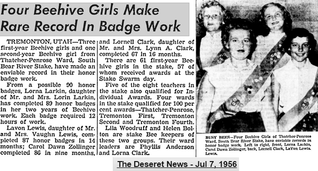 The Bee-Hive Girls program started in 1913 (after a brief adoption of the Camp Fire Girls program) for the Church of Jesus Christ of Latter Day Saints girls and non-LDS girls. It was a distinct program with unique awards, lasting many years and like many programs, went through many changes. It was a highly structured program, each month had a special program to follow.