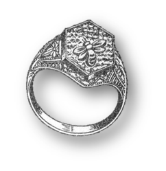 This Bee Ring was the highest honor a Bee Hive Girl could earn until the metal shortages of WWII, then a special felt award was introduced. Bee Hive Girls continued to have various charms and pins to earn and wear for many years. In March of 1949 a charm bracelet was introduced, with 7 charms to earn, one for each field of study, plus one charm for Honor Bee. |
