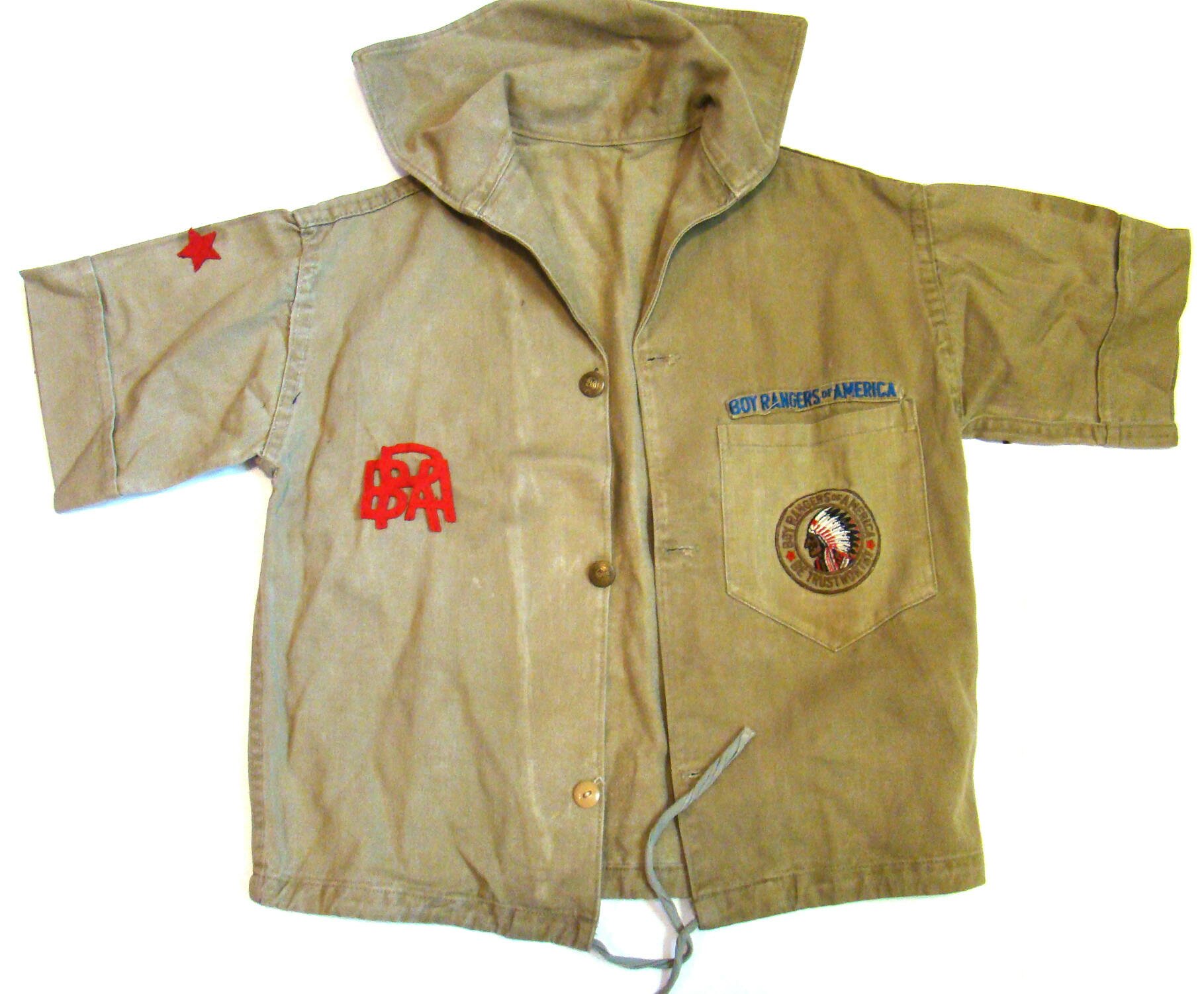 Dominique writes: The patches on right sleeve is a red felt star, on right chest there is a red felt Boy Rangers of America logo. On the left pocket is the boy Ranger of America” Be Trustworthy “ patch and above pocket the Boy Ranger of America Patch. On the left sleeve in yellow felt is the tribal insignia and below that is the rank. There are two of the three official buttons as the bottom one is missing. Draw string on bottom of shirt. There are no mfg tag on the shirt. Dimensions are 16 inches across shoulders,10 inches from armpit to bottom 17 inches across bottom. There is a 6 inch collar on back and is 13 inches across.