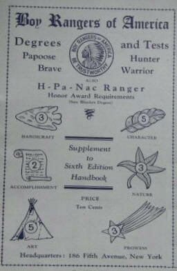 Before the Cub Scouting program began Emerson Brooks founded the Boy Rangers of America program to provide a group activity for boys too young for the Boy Scouts. Heavy emphasis was placed on Native American lore, ceremonial costumes, handicrafts and citizenship programs. Boys were strongly encouraged to sign an Anti-Cigarette League Boy Rangers of America Pledge, stating that they would not use tobacco until they were at least 16. Boys learned the Ranger War Whoop, Yells and Hails. There was a special salute and secret grip when giving a handshake. Program had summer & winter uniforms and Indian costumes.
