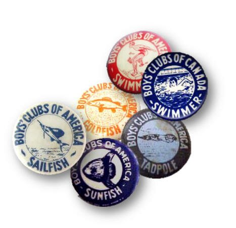 This charming collection of Boys' Clubs of America (and one from Canada) Swim Buttons makes a wonderful keepsake. For some boys the local Boys' Club was their only access to learning the important skill of swimming. Working their way through the levels inspired confidence in their abilities.