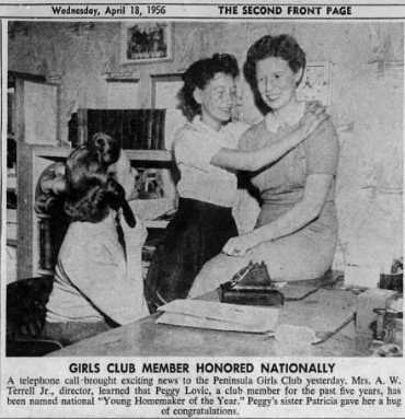 Peggy Lovic, 17 of Newport News, VA - 1956 (The following year she won the national Lucile M Wright Citizenship Award from Girls' Clubs of America, as well.)