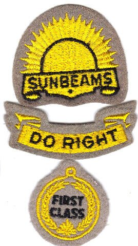 "Sunbeam" patch - beginner rank "Do Right" patch - second class "First Class" patch - first class |