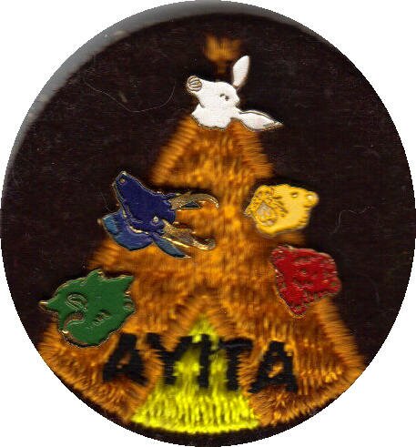 AYITA patch is brown felt with gold & yellow embroidery. Tiny pins are listed below. The AYITA Camp Award may be earned each year that a Sunbeam attends divisional camp and completes the requirements of participation in the full camp period, engage in a Bible Class, pass one test, and make a craft. The awards are: 1st year – Little Deer/white 2nd year – Busy Beaver/yellow 3rd year – Strong Bear/red 4th year – Swift Antelope/blue 5th year – Mighty Buffalo/green 6th year – Raccoon/purple |