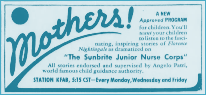 The Sunbrite Junior Nurse Corps was a movement sponsored by Sunbrite Cleanser and promoted through the radio program Sunbrite Junior Nurse Corps. First launched in February 1936 it ran 3x a week for over 2 years, generally around 5pm - for 15 minutes. The host of the program was the "National President" of the Sunbrite Junior Nurse Corps Dorothy Hart, played by the young actress Lucy Gilman. Helena Ray played her trusty Aunt Jane. Prior to the launch of the program and during its run, mothers were assured that the programming was safe, suitable and beneficial for its audience. Famed child guidance leader Angelo Patri supervised each script. Florence Nightingale, Clara Barton and "Sa-ca-ja-wea, Indian Princess" were part of the programing. After pledging themselves to the aims of the Sunbrite Junior Nurse Corps, girls could save Sunbrite (and later Quick Arrow Soap Flake) labels and "buy" the official Sunbrite Junior Nurse Corps uniform that National President Dorothy Hart always appeared in, and other items such as the official ring, toothbrush, hairbrush, first aid kit and more. Girls were encouraged to learn First Aid, form groups of Junior Nurse Corps - and encourage their moms to buy Sunbrite Cleanser. "Service Button" of the Junior Nurse Corps